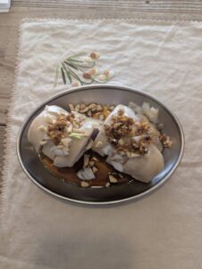 茹でた鶏肉に香辛料を使ったタレをかけてます。